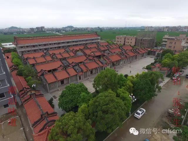 其建筑格局,是由八座“四点金”簇拥一座大祠堂连“后库”构成的潮汕特色民居。祠堂“后库”相当一座“四点金”的规模,整围建筑群呈中心对称,共构成“五街六巷”,背连一栋建筑面积约三千多平方米的三层楼作为“后包”。