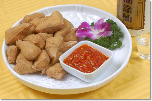 民俗小吃。用大豆作主要原料,掺以薯粉、石膏、卤水制成的豆制品。制作工序是:磨浆、除渣、煮浆、配膏、试粉、掺膏粉、拌和定卤、包块、压块、煮熟,有的煮熟后还用栀子上色。特点是外皮柔韧,内肉嫩滑。
