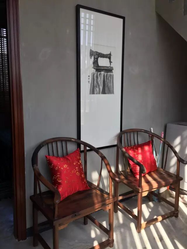2楼起居厅,墙面的老针车挂画是小宝的杰作。配上定制的船木椅可以让婆婆偶尔坐在那边晒晒太阳。