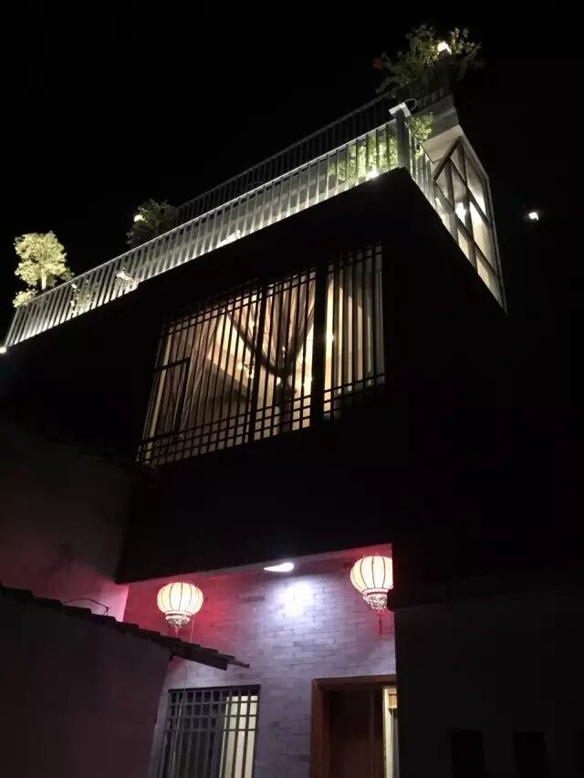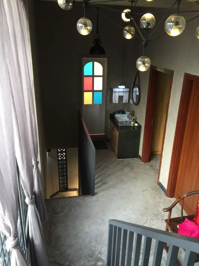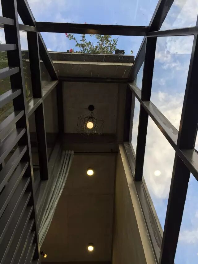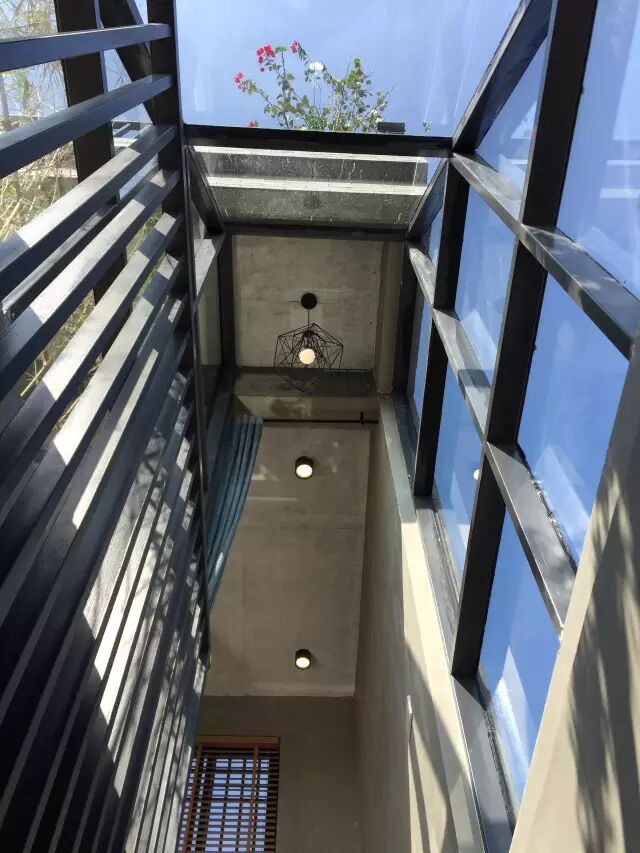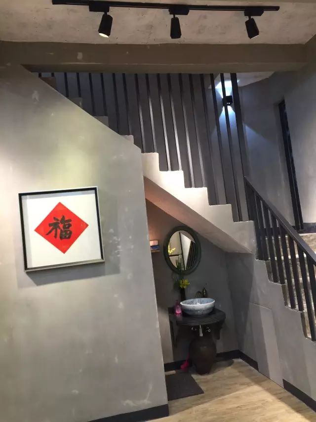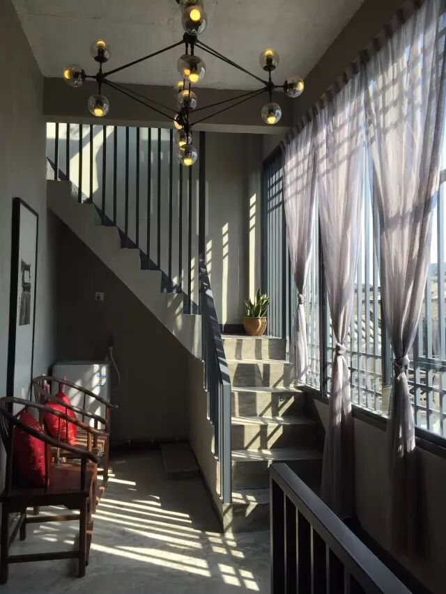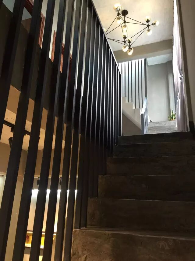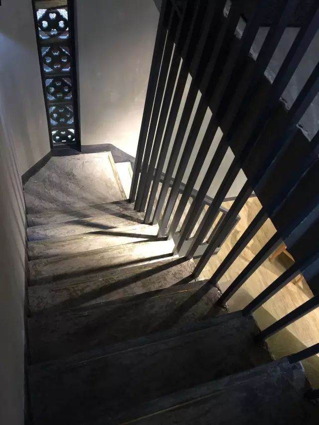 为了给楼梯有空间感与光线采用了铁护栏和青通花窗的做法,一楼与二楼的楼间自然粗旷的天然材质依次出现,水泥、老味青通花窗,线条感十足。