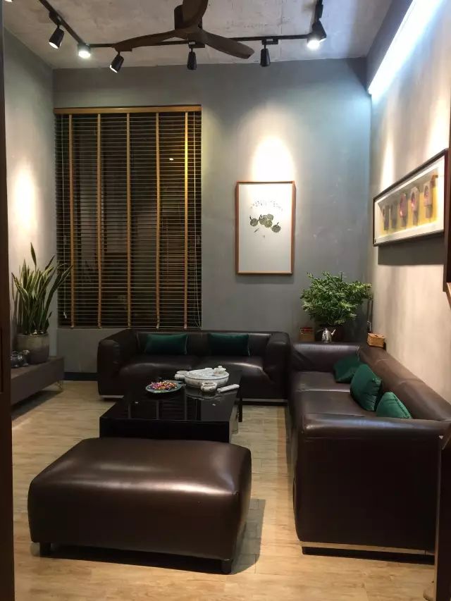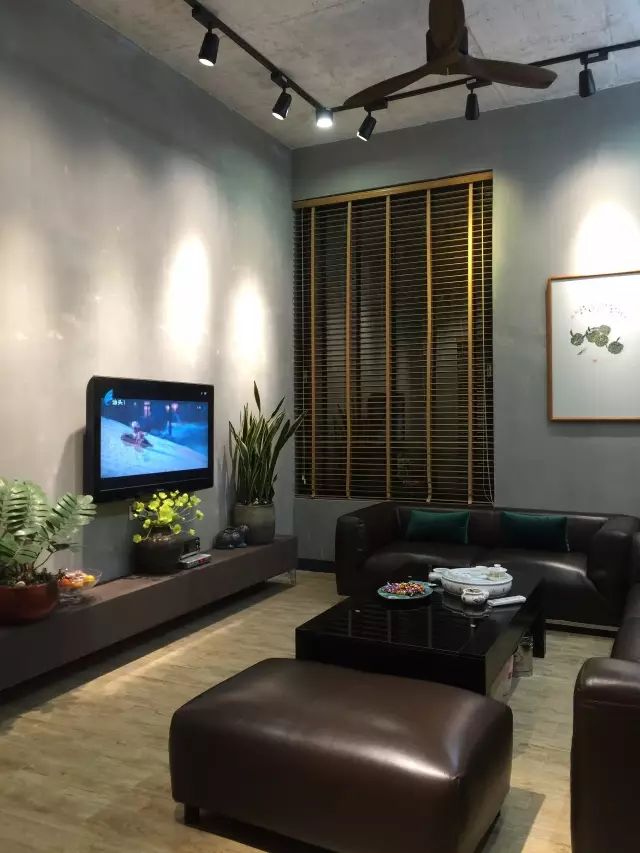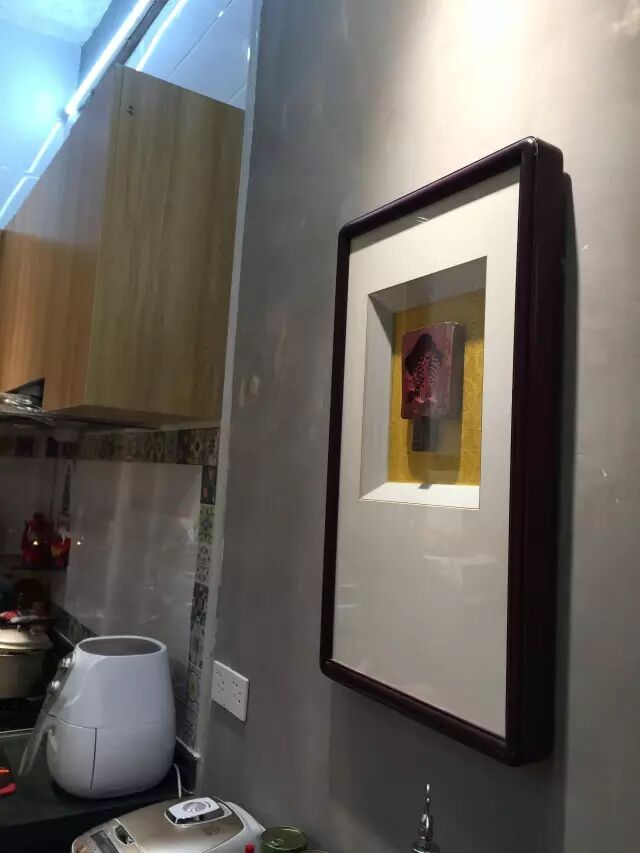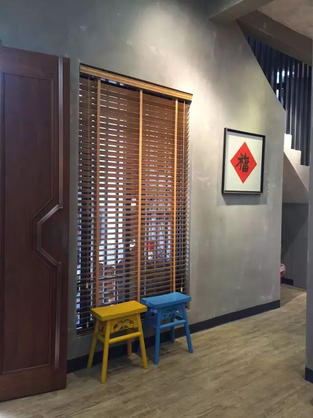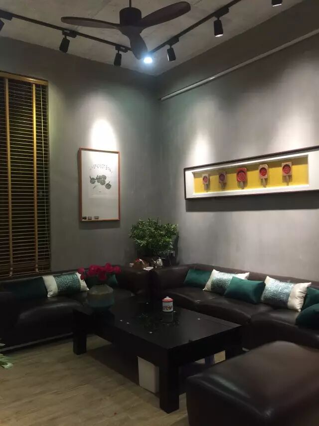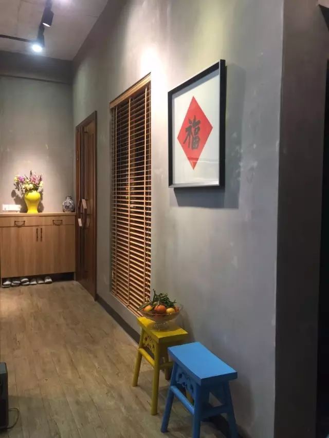 一楼客厅,水泥墙面与地板相衬浅灰色 DlY中国红的糕印挂画点缀。