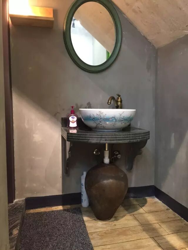 一楼的卫生间门口洗手台,因台盆下面排水管道不好看。给它装上一个老陶缸包装一下还挺好看的。