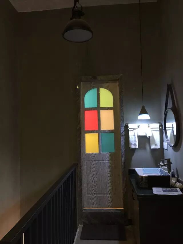 2楼卫生间,为了方便婆婆,利用梯口做了间干湿之分的淋浴室,空间小,决定把门做成谷仓轨道推拉式。因灰色墙面感觉冷决定把白色卫间门页白玻DIY贴上彩膜。