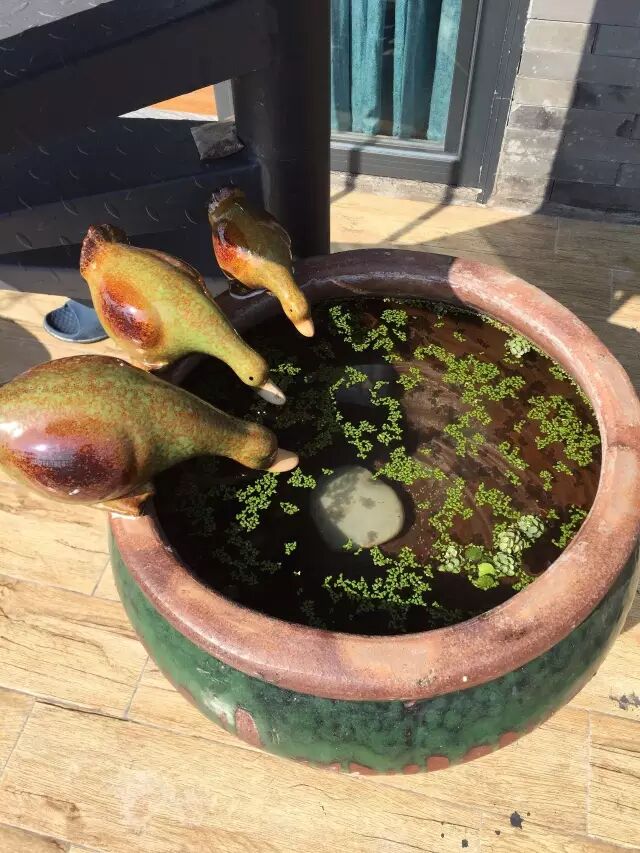 二楼小阳台的鱼缸自己粘上了3只可爱的鸭子