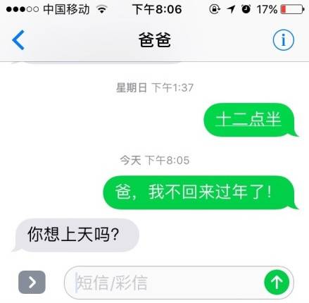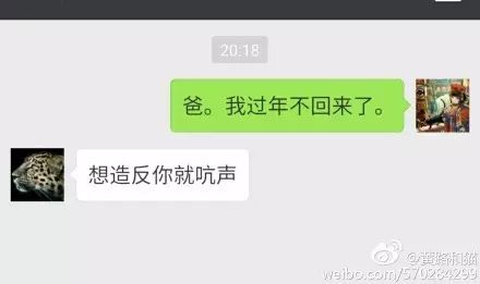 然而,最近微博上火了这样一个非常“作”的话题:给老爸发一条“爸,过年我不回家了”,你会收到怎样的回复?