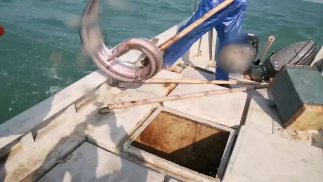 这条酷似《异形》怪物的鱼类凶悍异常,连摄影师都不敢靠近。大家别看它其貌不扬,这可是汕尾地区鼎鼎有名的麻鱼。麻鱼学名海鳗,每年11月从台湾海峡游入浅滩产卵,第二年春后再游回深海。要吃上这种怪鱼,离不开天时地利人和。
