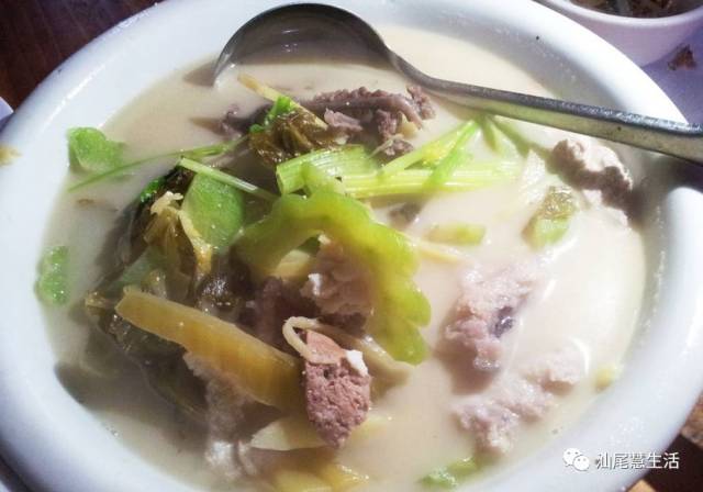 咸菜苦瓜麻鱼汤,极品名菜,不可不尝。汤味甘甜,除了清热,还有明目解毒、健脾利水之效。正宗的麻鱼咸菜一定要选用带春的鲜活大海鳗,先沿截面横切成约三公分的厚块,鱼春洗净后整块放人,然后加入大量的咸菜和苦瓜,猛火烧开后再文火焖煮半小时,至咸菜的酸鲜滋味和苦瓜的甘苦味道被麻鱼吸收,汤汁变得浓稠,便可熄火上盘。