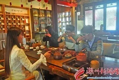 ▲外地来到的游客,在茶舍里品一杯工夫茶,感受潮州文化。