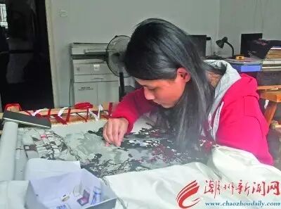 ▲在绣娘一针一针的穿梭下,一幅幅精美的潮绣展示在游客面前。