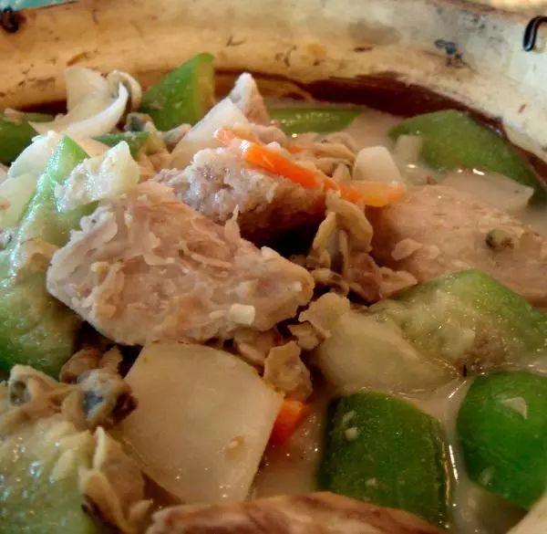 3、投入水瓜、蚬肉,与香芋一起煮,调入盐、鲜奶、味精,至水瓜熟即可。