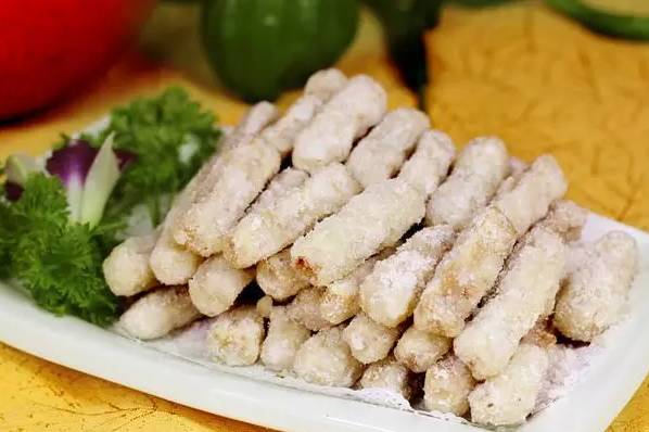 2、锅中倒入适量食用油,待油热6成后,下芋头条小火炸3分钟左右后捞出,稍凉后中火下过再炸一分钟上色;