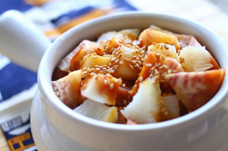大芋头三分之一个、白砂糖4汤匙、水5汤匙左右、食用油适量。