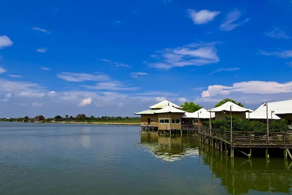 因为水色碧绿如玉,而被人们称为玉湖。景区内宽阔的水面具有调节气温的作用,在小范围内形成了冬暖夏凉的小气候,全年平均气温23摄氏度,气候十分宜人,是天然的“超级氧吧”。