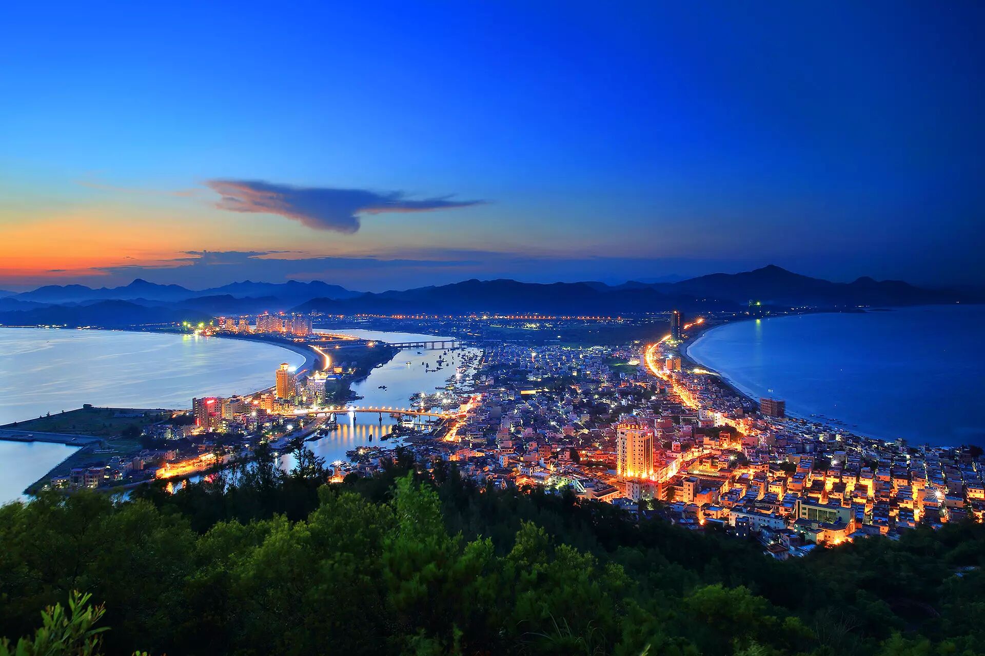 双月湾因形状鸟瞰像两轮新月,故名双月湾。由于风向原因,形成了左湾水色不清,右湾水清见底的景色。两条沙垅直奔大星山,如蛟龙出海,似双龙戏珠,有静有动,十分壮丽。