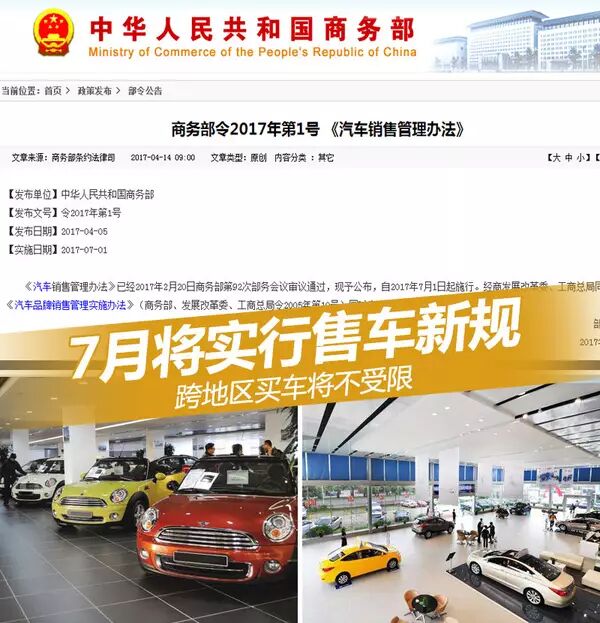 新政来了!《汽车销售管理办法》已于2017年2月20日审议通过,并于2017年4月5日发布,自2017年7月1日起施行。经商发展改革委、工商总局同意,《汽车品牌销售管理实施办法》(商务部、发展改革委、工商总局令2005年第10号)同时废止。