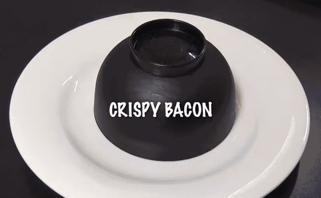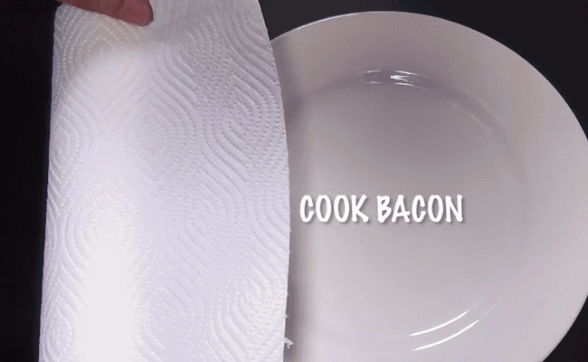 还可以将碗倒扣在碟子上,放上培根,然后盖上厨房纸,微波炉叮1分钟就可以了,好吧,这个方法虽然不用洗碟子,可是碗会变油。