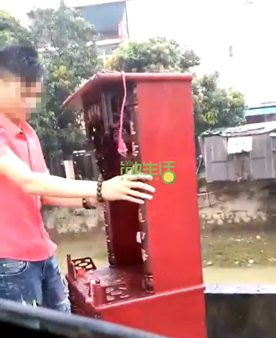 近日,网络上出现几段让人瞠目结舌的视频,视频中一位穿着红色衫衣的男子将供奉财神爷的神龛连同神像一起搬到了河边,大喊几声后就将神龛等物品一起扔进河里,最后还声称自己是普宁洪阳某某村的方某某,并且也一直在强调整个普宁市只有他一个方某某。