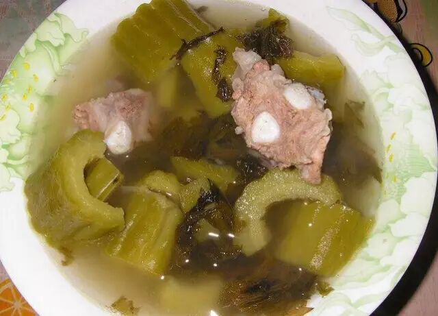此汤乃潮 汕家庭经典汤水之一,苦瓜、猪骨、黄豆熬制出来的汤水浓郁芳香,熬制后再豪爽的撒下一把酸咸菜,生滚两下后又再豪迈撒下一点香菜,既苦且咸,有助健脾开胃,润肺提神,不喜欢苦瓜的朋友也会被这道汤所折服!