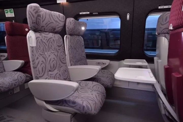 每列高铁有8节车厢,可提供579个座位。其中,第一节及第八节车厢为头等车厢,共有68个座位,第二节至第七节为二等车厢。车厢内还特意设有2个轮椅座位。