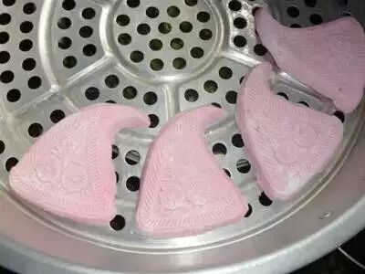 4.把做好的红桃粿放到蒸垫上蒸15分钟,再焖5分钟,就可以啦!