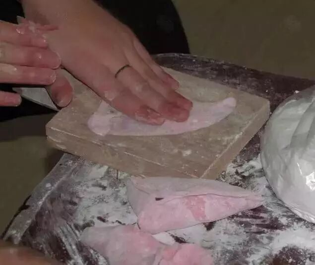 3.用手抓一个米团包上馅料,用红桃粿专用膜具印出来