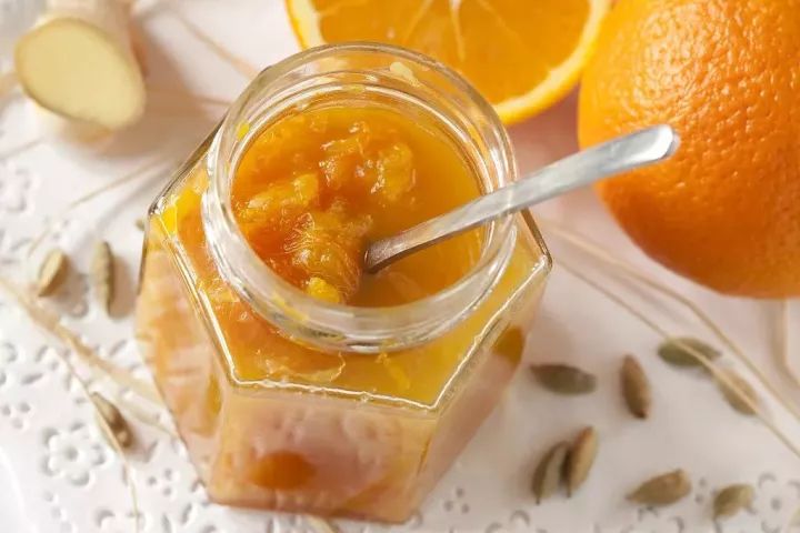 将橘子皮剁成碎末,重新放入锅中。加入适量的白糖、糖精等等,再加水煮沸熬成稠糊状就成橘皮果酱了。