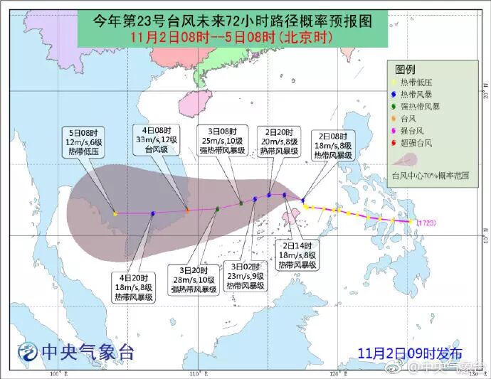 位于南海南部的热带低压已于2日8时加强为今年第23号台风“达维”(热带风暴级,英文名:Damrey,来自柬埔寨,意为大象),2日上午9时,其中心距离越南胡志明市偏东方约1190公里,也就是北纬12.6度、东经117.4度,中心附近最大风力8级(18米/秒,相当于65公里/小时),中心最低气压999百帕。
