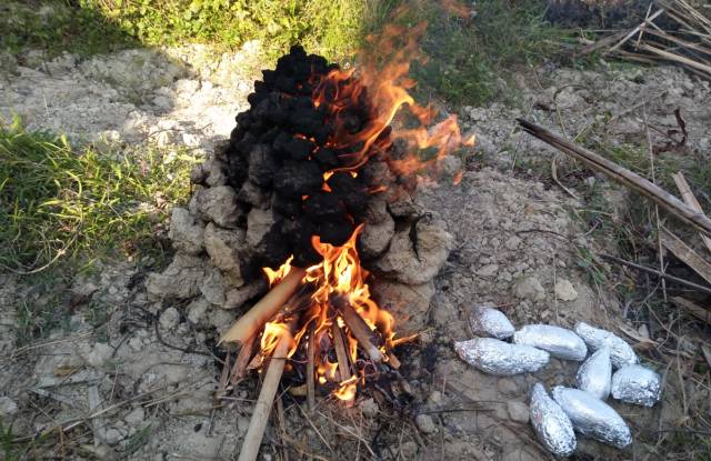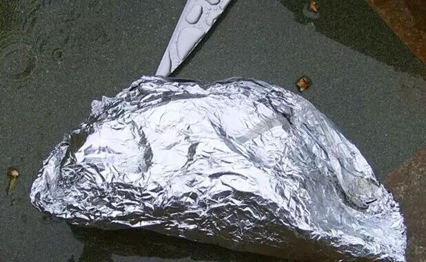用锡箔纸把包了一层荷叶或芭蕉叶的土鸡封好,要包严实一点,不然,泥巴跑到鸡里面,就没得吃了。