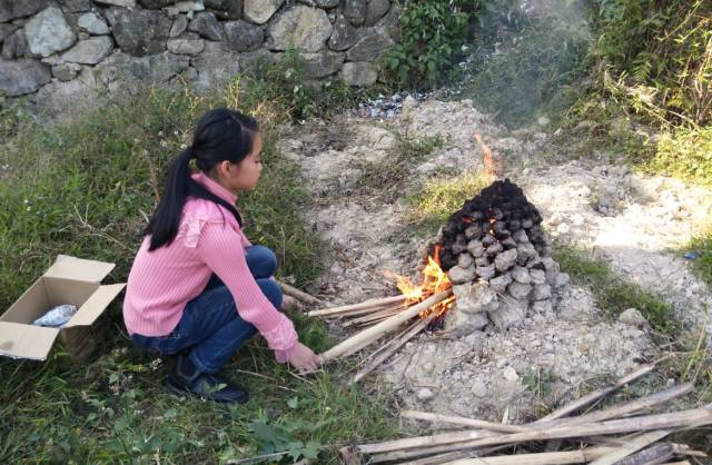 各种杂木干柴往窑里丢,火越旺越好。窑烧得越红透,窑出来的红薯和鸡就越香。