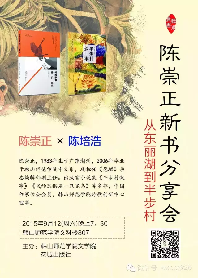 活动内容:分享小说集《我的恐惧是一只黑鸟》的创作经验,谈谈潮汕文学元素对写作的影响。