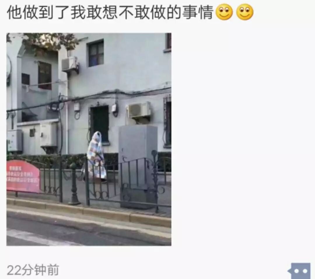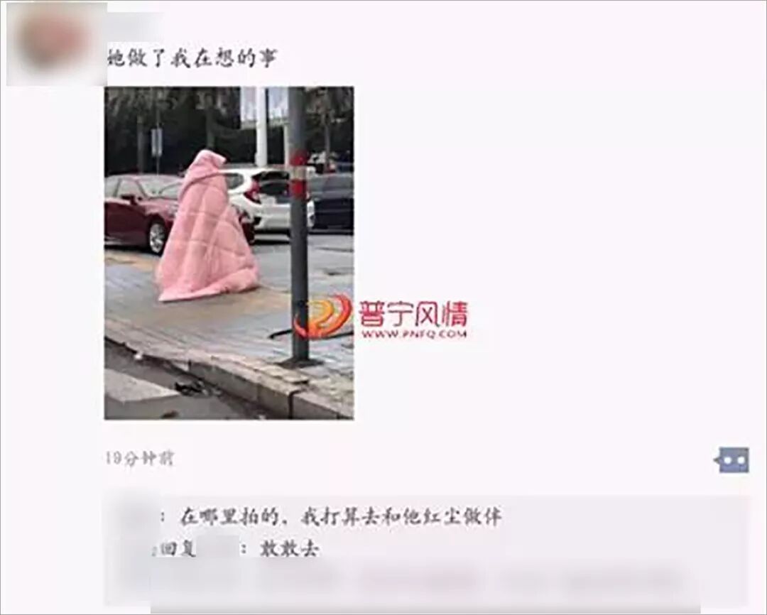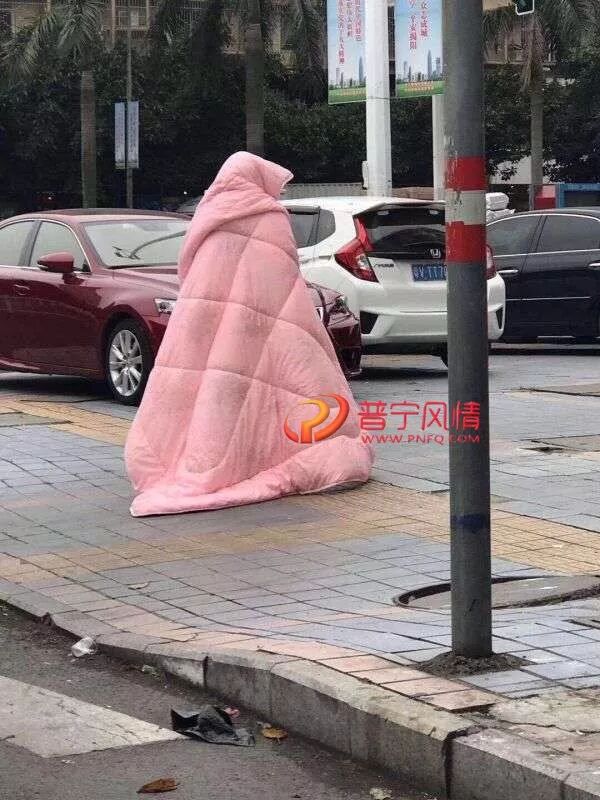 今天,潮汕某地街头出现了搞笑的一幕,网友看见有人裹一张粉色棉被行走在马路上,于是立即用手机拍摄下来发到朋友圈,随后在潮汕人的朋友圈刷屏。