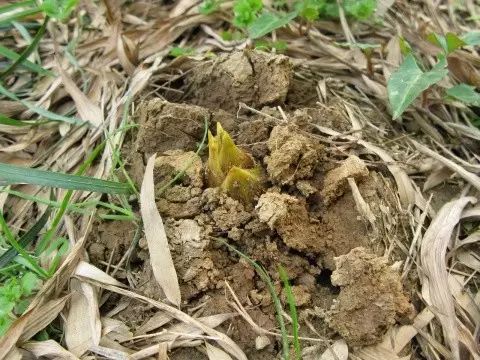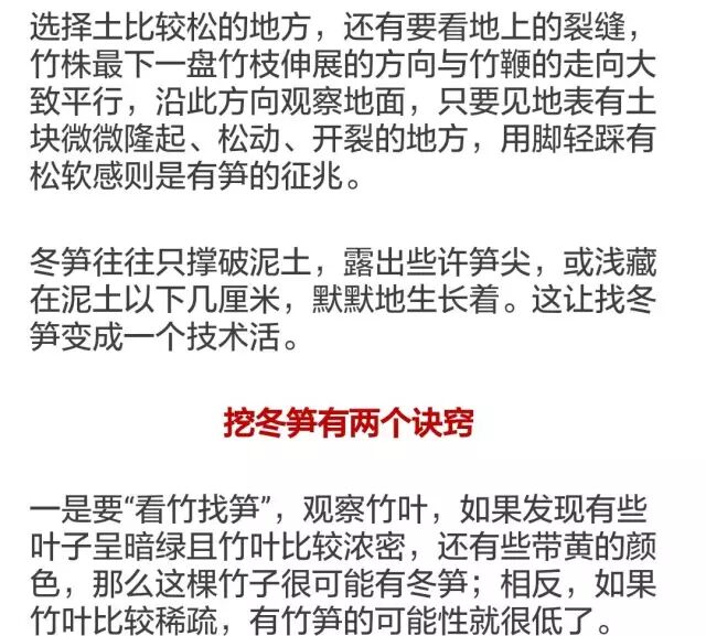 二是注意地面的细节,埋藏冬笋之处,往往泥土会稍稍隆起,并且伴随着一道裂痕,这就说明“土里藏笋”。