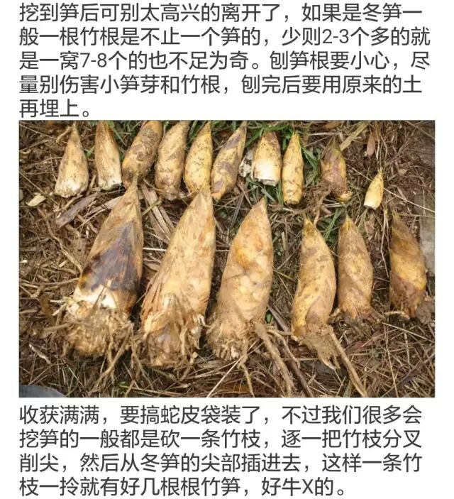 不过也要提醒大家,冬笋是好料,但也不能过度采挖,尤其是不能为了挖掘冬笋而大肆损坏竹根,因为来年春天这些竹根是要生长春笋的。