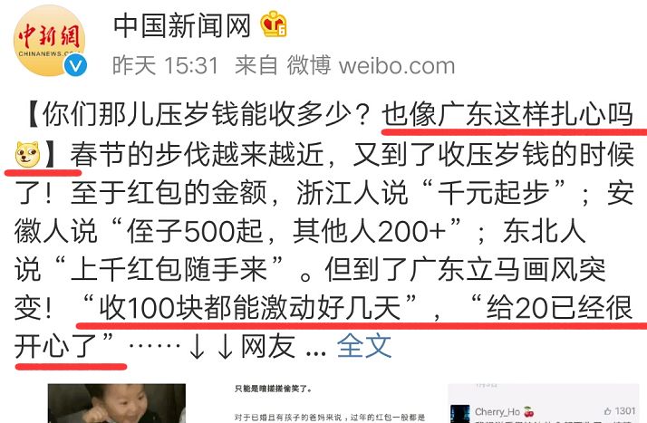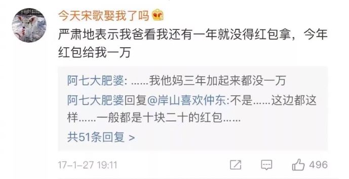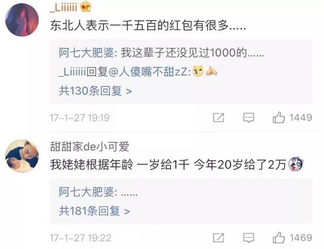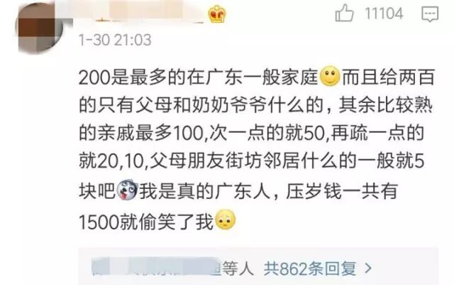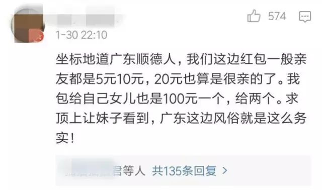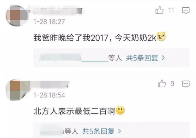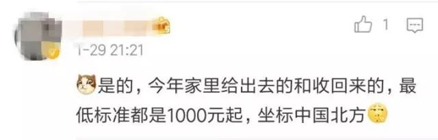 @Chi_Ro:我们家只要不是每年都回家过年,2000起步。要是遇上你升学娶媳妇这类喜事,大部分都是给一万(媳妇怀孕那年还得加,因为有孩子你就没红包了,这算是你最后一次)。