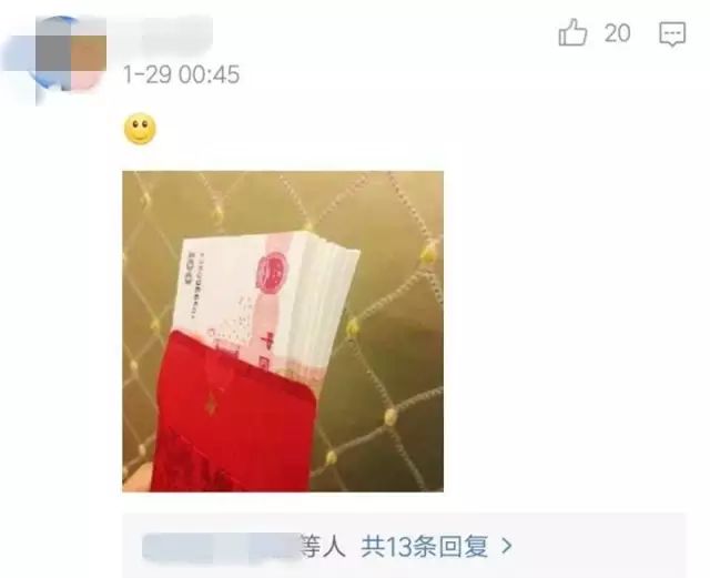 @墨雷O_o:一个长辈一千,然后一家三个长辈,再加上我是家里最小的,所以我拿我俩哥的那两份(他俩年龄到了不能收了)所以我一个人拿三份。