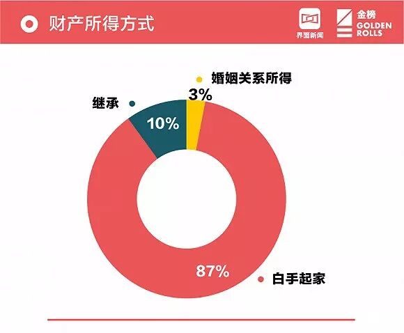 从财产所得方式上看,59位女富豪中,共有51位是白手起家(占比87%),从家族继承得来的有6位,占女富豪总数的10%,如A股中最年轻的董事长阮静波,在家中突发变故之后,勇担重任,出任闰土股份(21.150,0.16, 0.76%)董事长,年纪轻轻却拥有67亿资产,在女富豪榜中位列第22名;而另外3%是从婚姻关系中所得,如涌金的陈金霞在丈夫意外过世后,独自带领“涌金系”,现凭借186亿的资产在女富豪榜中排名第八。