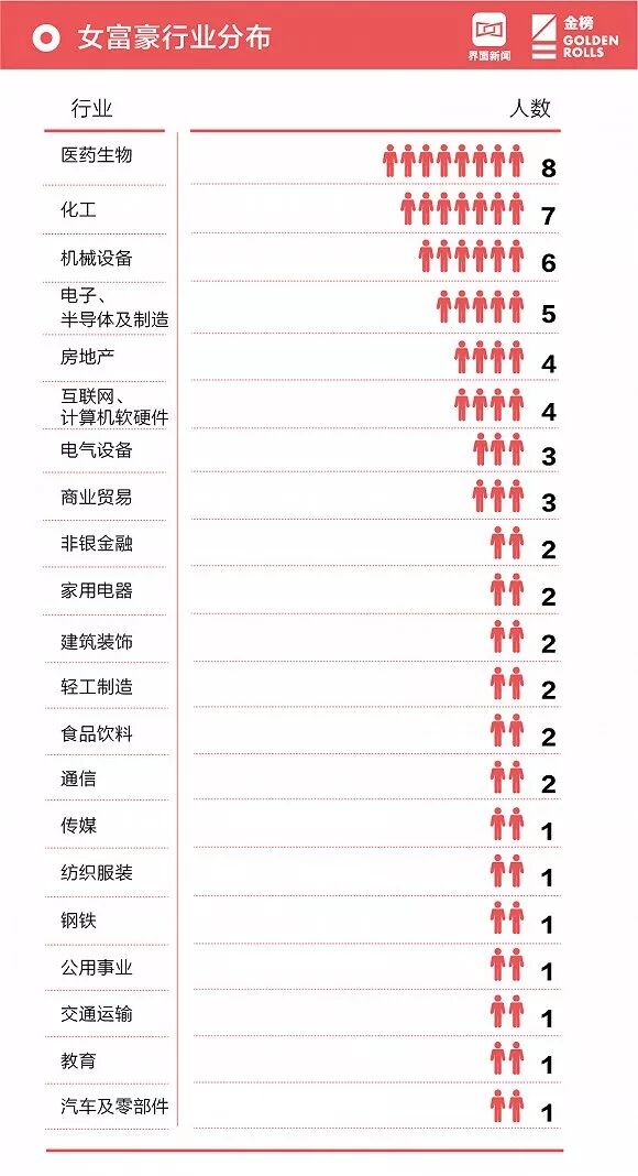 从行业分布来看,在女富豪榜中,排名前三的行业为医药生物,化工和机械设备,分别占女富豪总数的14%,12%和10% ;大体上看,与总富豪榜的行业分布差别不大,但是房地产行业在总富豪榜中位列第二,在女富豪榜中排名第五。