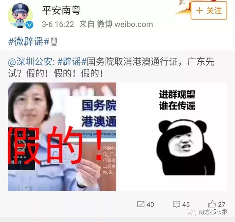 昨天(6日)下午,广东省公安厅官方微博@平安南粤、广东省公安厅出入境管理局官方服务号@广东出入境、深圳市公安局官方微博@深圳公安 发布公告辟谣,表示网传消息是——