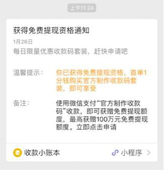截止2018年12月31日,商户使用“官方收款码”进行收款,可以累加免费提现额度。