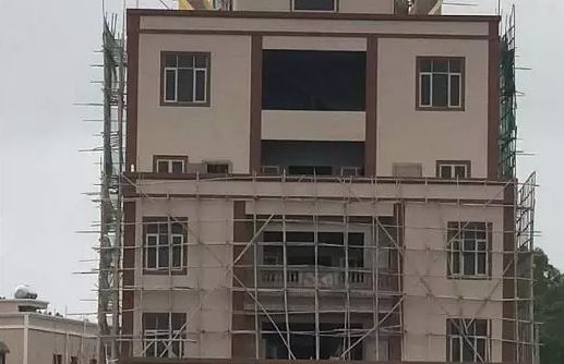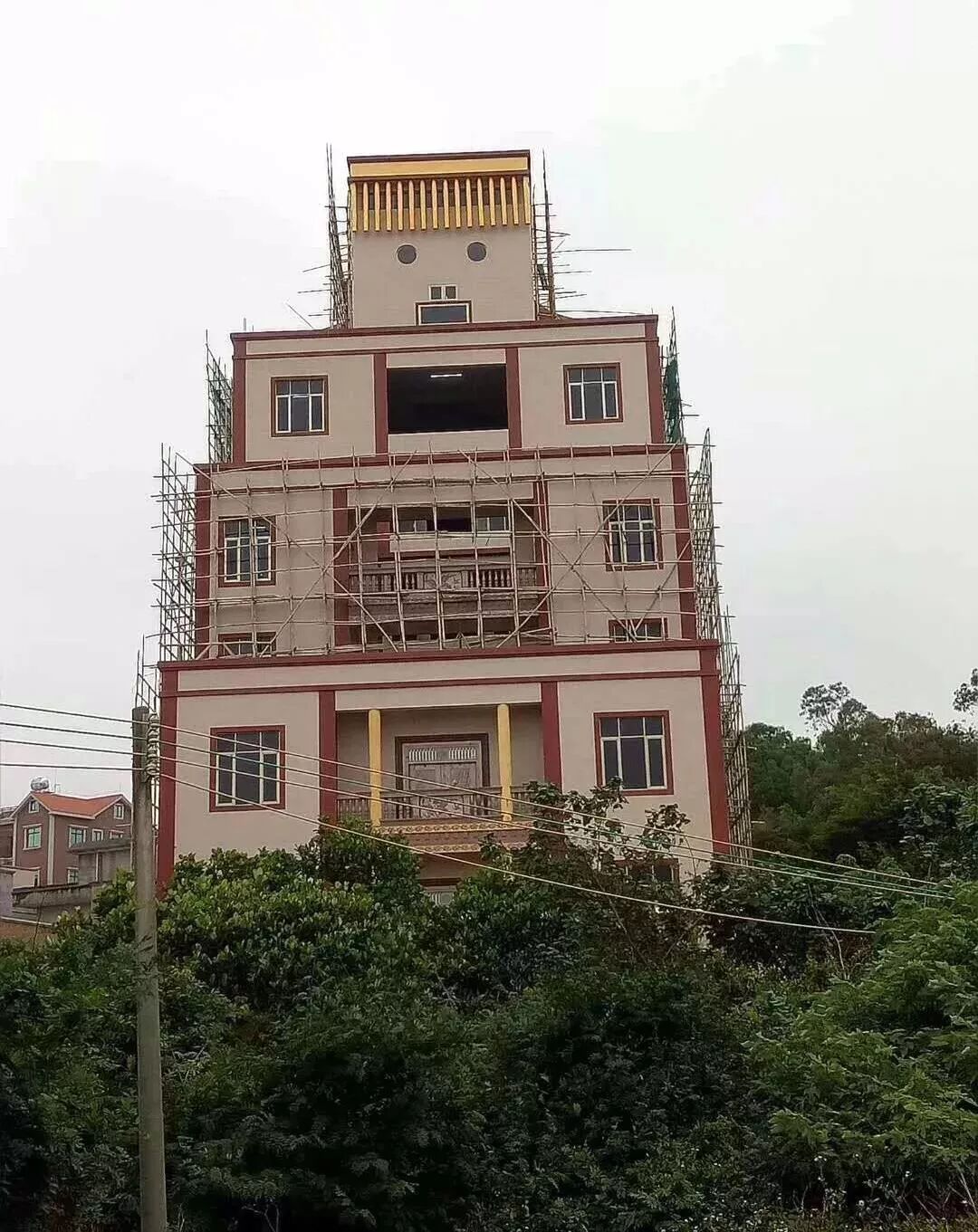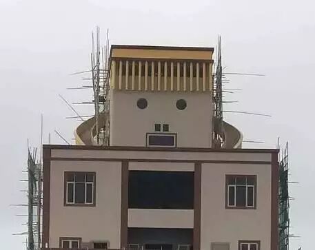 从图片可以看到,这个楼房顶屋神似一个人的头部,有眼睛,有鼻孔,有嘴巴。最令人惊叹的,黄色部分像极了秦汉时期的皇帝帽子。