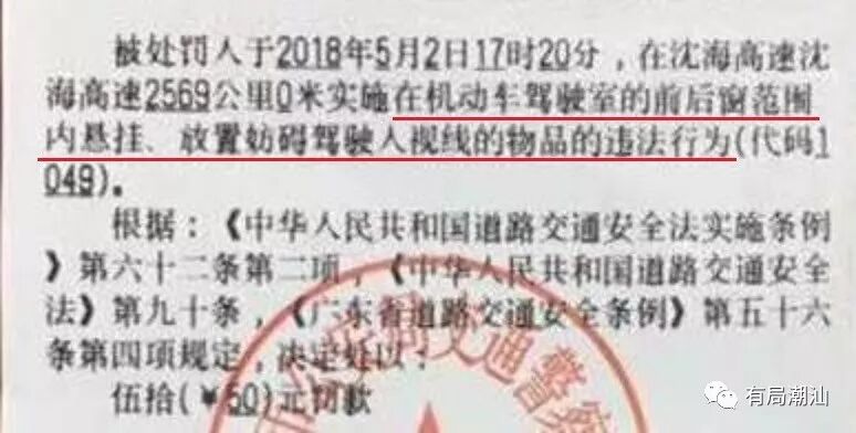 南海交警此前在接受采访时称,根据《中华人民共和国道路交通安全法》实施条例第62条规定,驾驶机动车不得有如下行为,其中第二项就是:“在机动车驾驶室的前后窗范围内悬挂、放置妨碍驾驶人视线的物品”。按规定是要进行处罚,罚款50元。