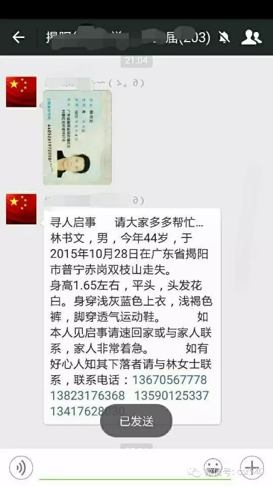 林书文,男,今年44岁,于2015年10月28日在广东省揭阳市普宁赤岗双枝山走失。 身高1.65左右,平头,头发花白。身穿浅灰蓝色上衣,浅褐色裤,脚穿透气运动鞋。 如本人见启事请速回家或与家人联系,家人非常着急。 如有好心人知其下落者请与林女士联系。