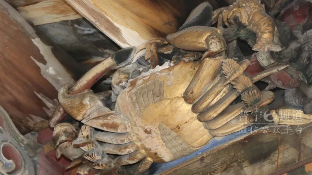 在普宁南溪镇钟堂村就有这样一只木雕大螃蟹,经历漫长的岁月仍然栩栩如生,无不惊叹当时的木匠是多么精雕。据说当年本来是有一对大螃蟹的,但有一只被偷走了,村民杨叔说:估计是爬到对面的河里了...至于为什么在祖祠里雕刻这样一对大螃蟹,仍然是个谜。