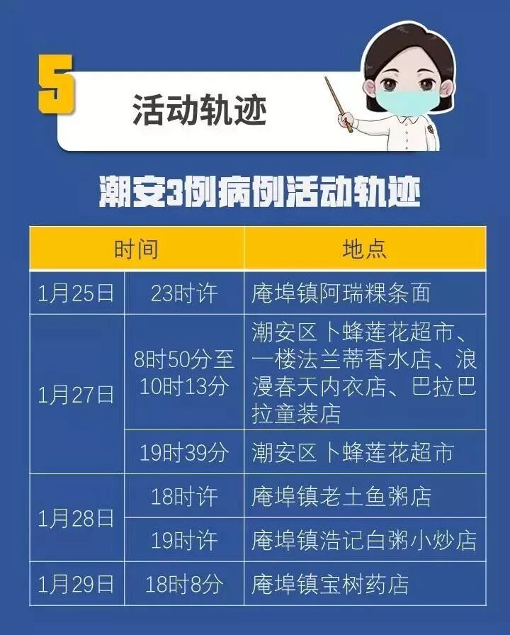 病例18(2月3日确诊):女,32岁,现住汕头市潮阳区关埠镇下底村,1月22日一家四人乘坐火车K799从武汉到揭阳,1月23日乘坐私家车到关埠林厝渡口坐船,再步行回家,当日下午到揭阳炮台采购物品。1月26日隔离观察,29日出现咳嗽症状并入院就诊。目前密切接触者均已隔离观察。