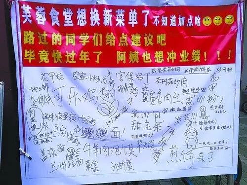 据厦门晚报,16日晚,厦大芙蓉食堂外贴出了一张海报,上面写着:“芙蓉食堂想换新菜单了,不知道加点啥,路过的同学们给点建议吧!”末了,还加了一句:“毕竟快过年了,阿姨也想冲业绩!”