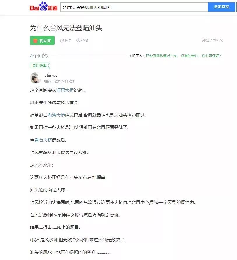 近年来,台风为什么都无法登陆潮汕?百度知道上一位潮汕网友道出了“真相”。