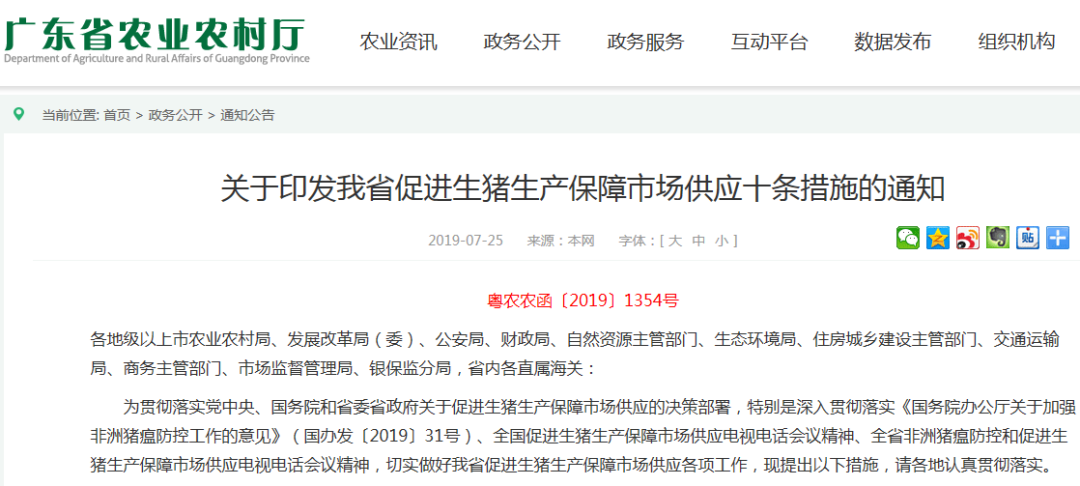这份编号为粤农农函〔2019〕1354号、由广东省12个部门联合印发出台的《通知》要求,切实做好广东省促进生猪生产保障市场供应各项工作,并部署10项措施,具体包括严格落实“菜篮子”市长负责制、切实落实生猪产业发展用地、积极强化生猪生产扶持政策、大力推进屠宰行业转型升级、健全猪肉市场供应保障机制等。