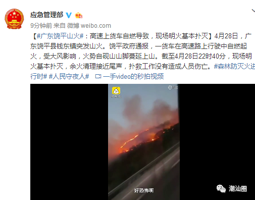 28日晚上21时许,饶平县森林消防大队队长钟晓群告诉新京报记者,现在山上有五六十名森林消防员在扑火,目前大概扑灭了四五百米的火线,剩余火线还有好几公里,此次森林火灾是由高速路边发生车祸的汽车漏油引起。因车辆自燃,故停放在应急车道。随后车辆自燃引起油箱爆炸,由于车辆停放位置靠近山,爆炸物引燃了山地杂草并迅速蔓延引起山火。