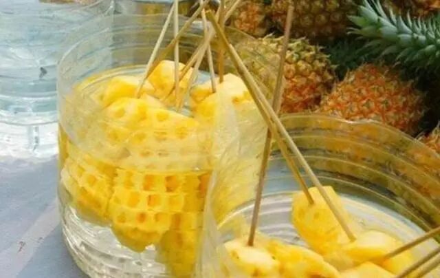 老板拿着个削皮刀不断来回转动,一个负责削,另一个则帮助扣洞,两个人技术非常熟练,最后将菠萝切开,然后穿上一只竹筷,放在一个盛满水的玻璃缸中。不过每次买菠萝时,一些经验丰富的人只要碰到冷盐水泡菠萝,指定不会去买,就连老板自己也不会吃,这到底是为什么呢?