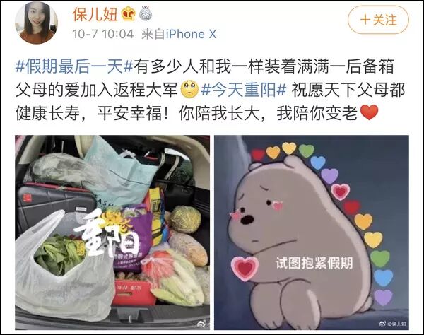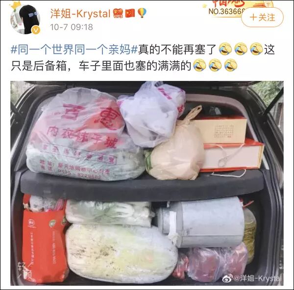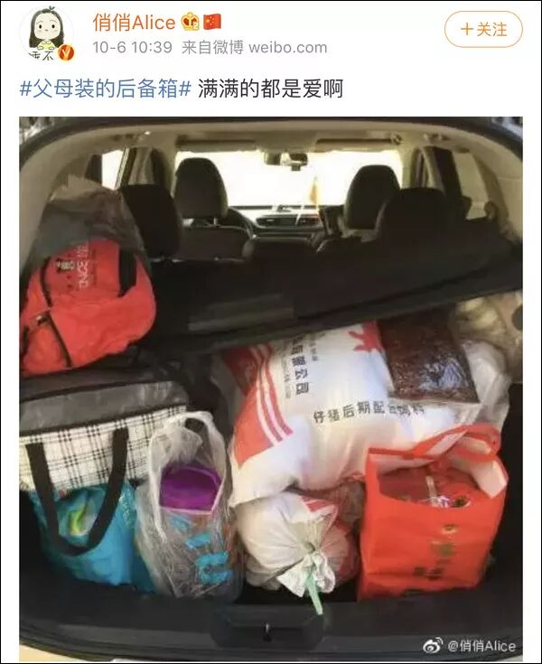 虽然对国庆假日依依不舍,但这样遗憾的心情,很快被父母长辈用爱装满的后备厢和行李箱治愈了。